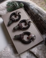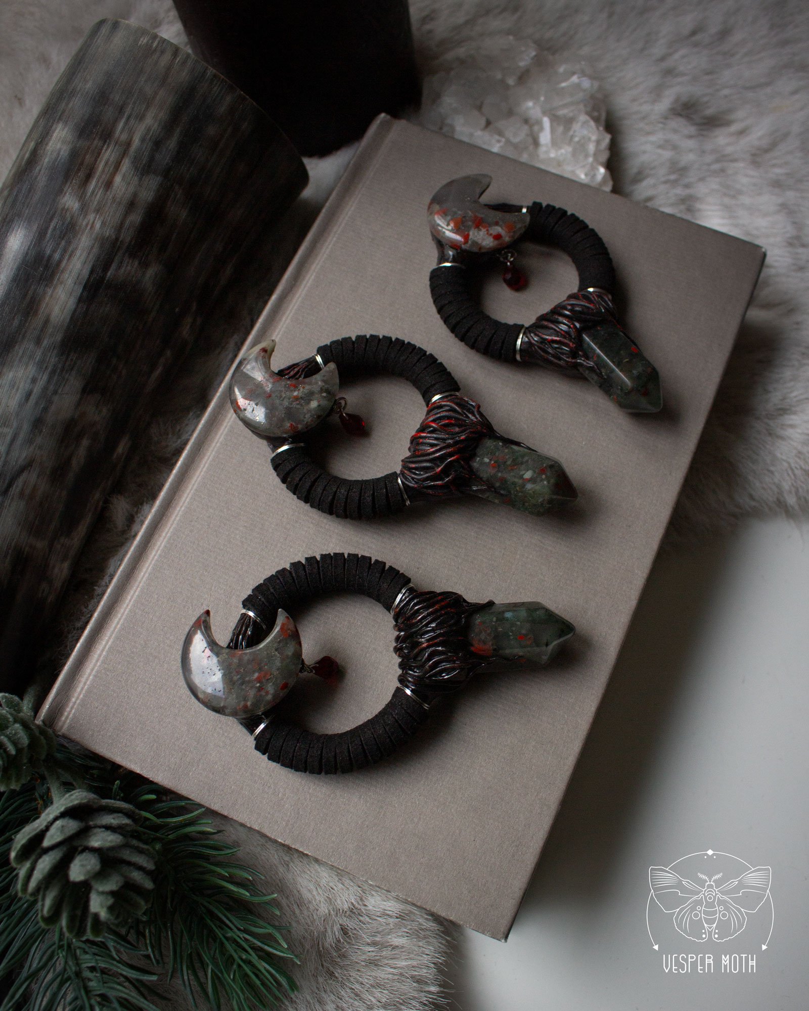 This beautiful statement piece consists of a big bloodstone point, formations hand formed out of polymer clay, a bloodstone moon placed above it, four 925 sterling silver wire ornaments and two long, soft textile bands. The Eternal Night Necklace is a limited design.