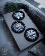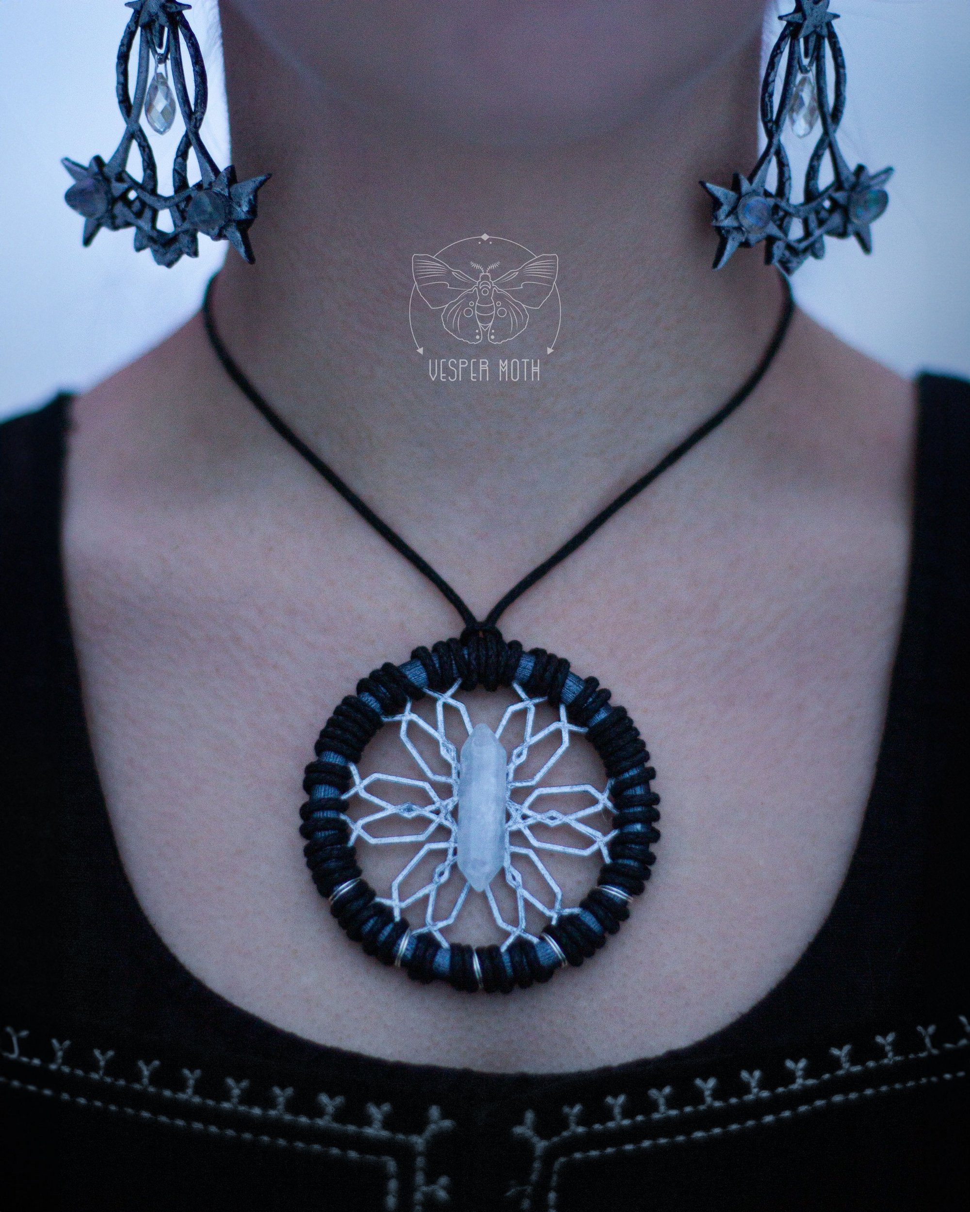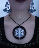 These enchanting designs are inspired by the beauty of crystallized snowflakes. The Frost Seidr Necklaces consist of a rock crystal, 925 sterling silver wire ornaments and two long, black textile bands. Even though the necklaces look pretty heavy they're actually very light weight since the ring and snowflake ornaments consist out of the plant based material Polylactic acid. They are printed with a 3D printer and the ring is wrapped with a black textile band. The Frost Seidr Necklaces are a limited design and look great when worn with a long or short band.