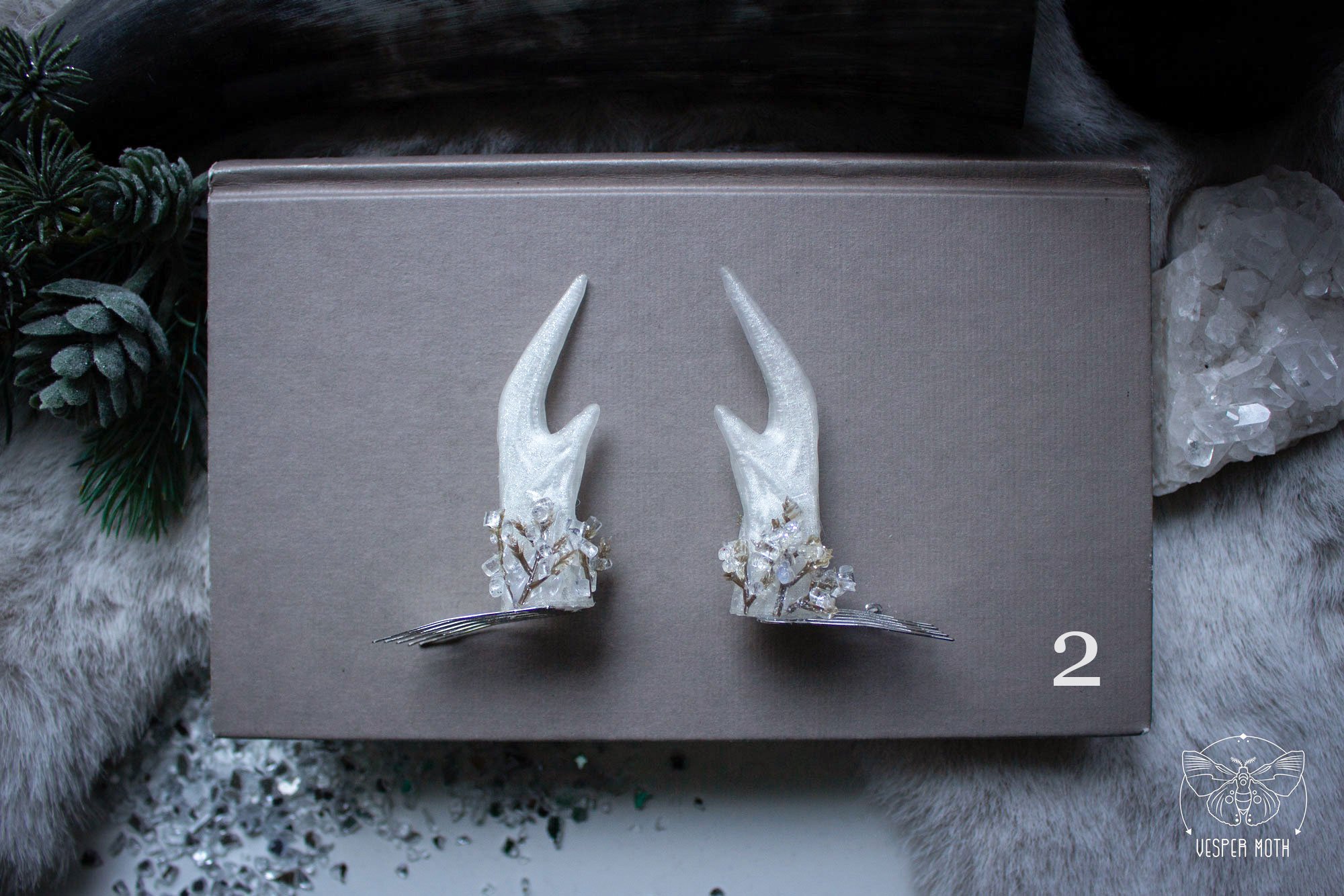 These enchanting hair pins are a limited design and despite their size the pins are super comfortable and lightweight to wear and they sit securely on once head. They consist out of the plant based material Polylactic acid. So even with all the decor attached they are very light weight. They are printed with a 3D printer and hand painted with silver coloured aluminium pigment powder and are sealed with a top coat.