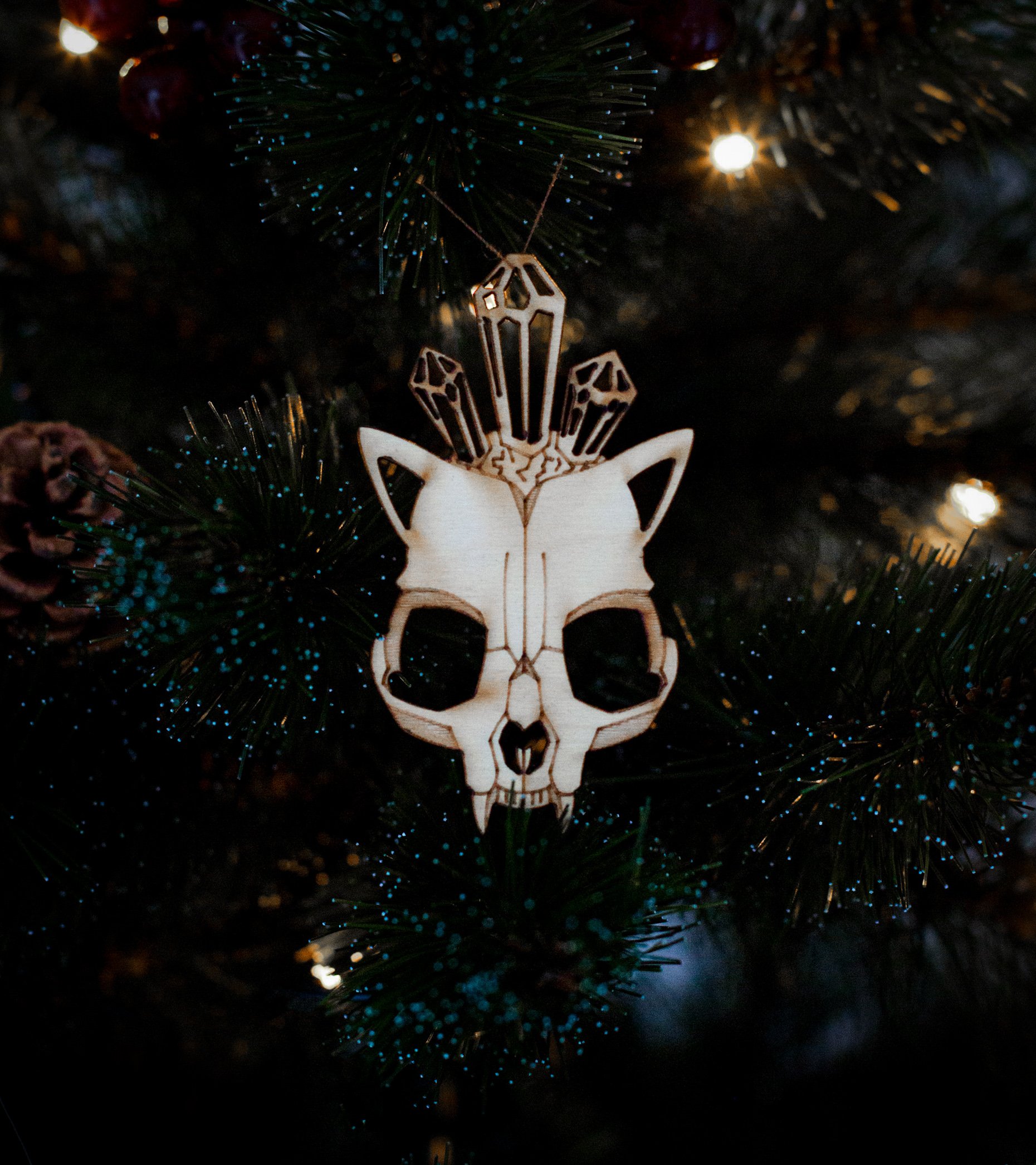 The wooden deer-, cat- & raven skulls are laser cut and decorated with three wooden crystal ornaments which are growing out of their heads.