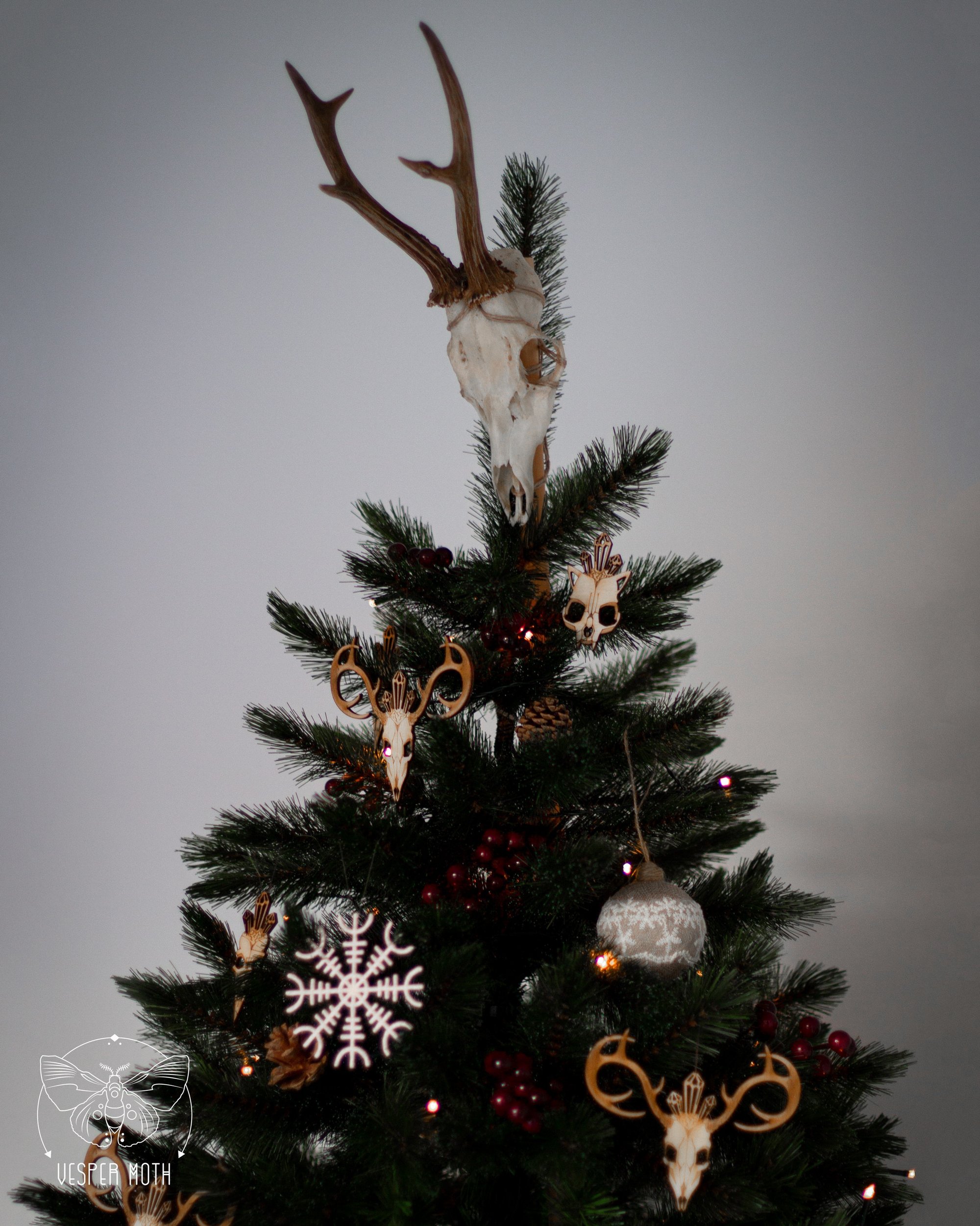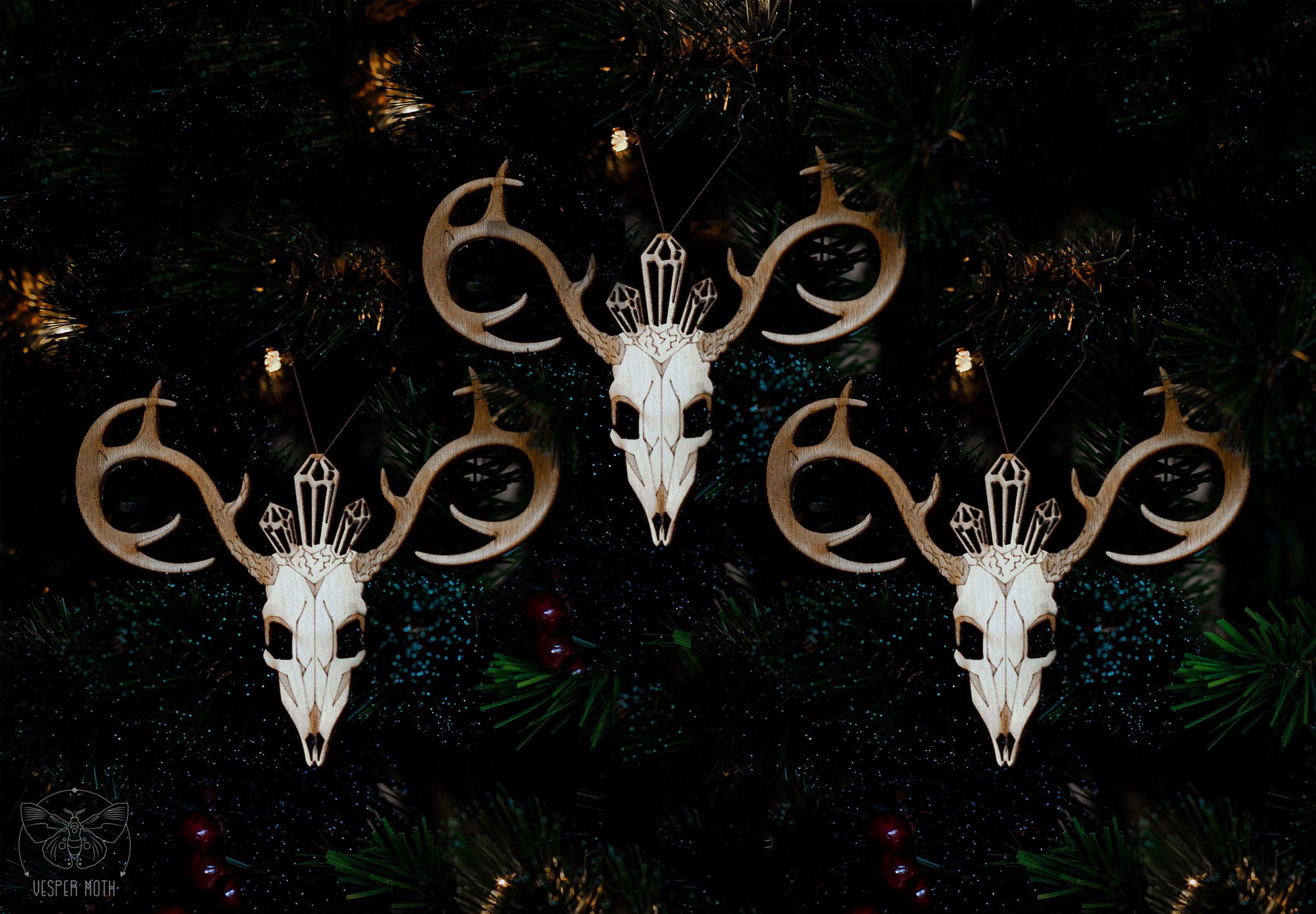 The three wooden deer skulls are laser cut and decorated with three wooden crystal ornaments which are growing out of their heads.