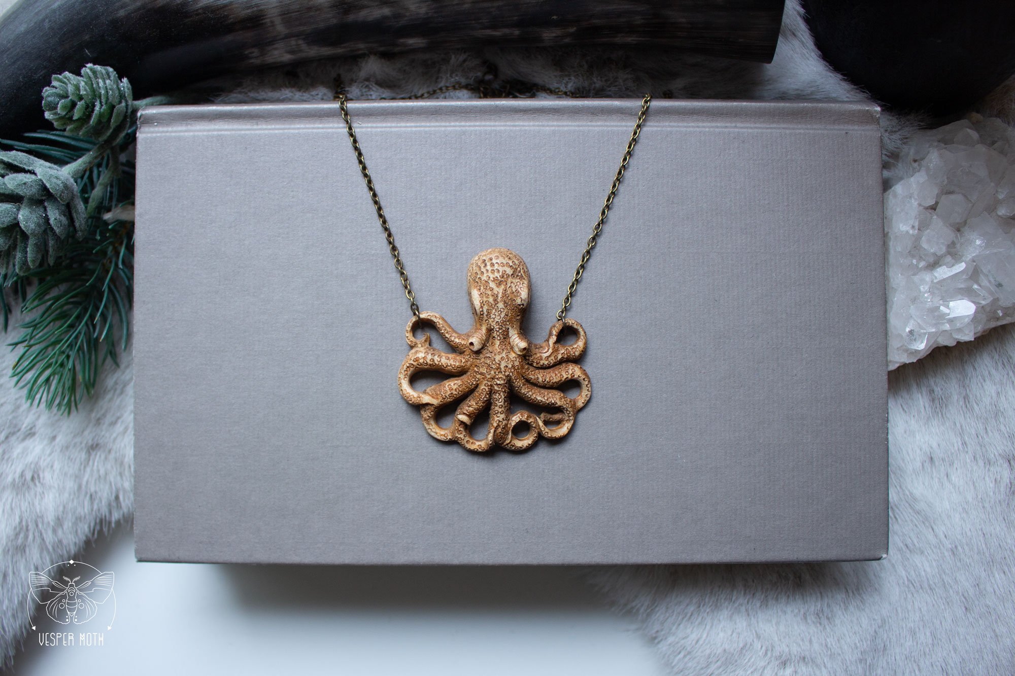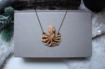 This statement piece consists of a beautiful hand carved, wooden octopus placed between two brass chains. The Lure of the Deep Necklace is a limited design and the octopus is created in collaboration with an independent carver.