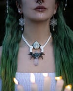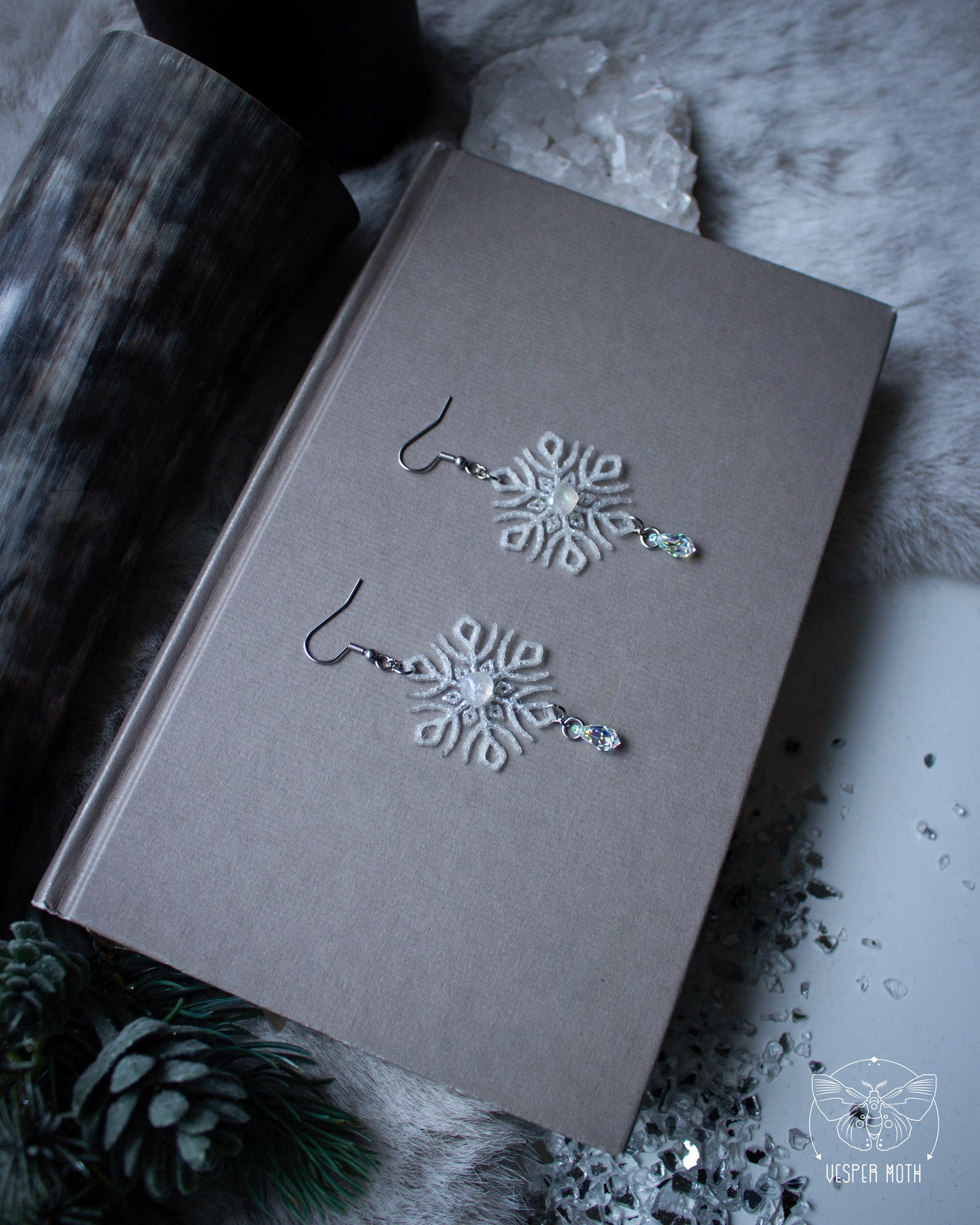 These beautiful snowflake inspired earrings might look heavy but they are actually very light since they consist out of the plant based material Polylactic acid. So even with the Swarovski crystals and angel aura quartz attached to them they are very light weight. They are printed with a 3D printer and hand painted with acrylic colours, silver coloured aluminium pigment powder and are sealed with a top coat.
